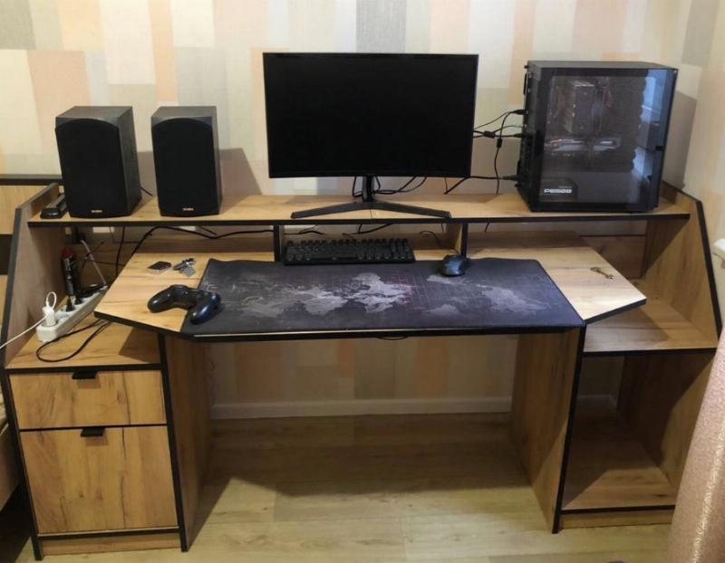 - Der Computertisch verfügt über offene und geschlossene Ablagen sowie ein Regal für die Systemeinheit und eine Empore für den Monitor.