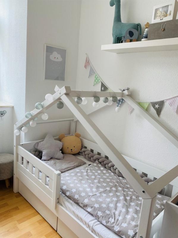 Mir gefällt besonders, dass es sich super in das Gesamtkonzept des Zimmers zum Thema Wald und Natur einfügt. Es vermittelt durch sein Dach ein Gefühl von Geborgenheit und lädt zum Lesen und Träumen ein. Das Dach lässt sich wunderbar dekorieren oder auch mit einer Decke zur Höhle umbauen. Mein Sohn hat das Bett gut angenommen, kletterte sofort hinein und bestaunte alles. Auch Besucher haben sich - unabhängig voneinander - dazu positiv geäußert.