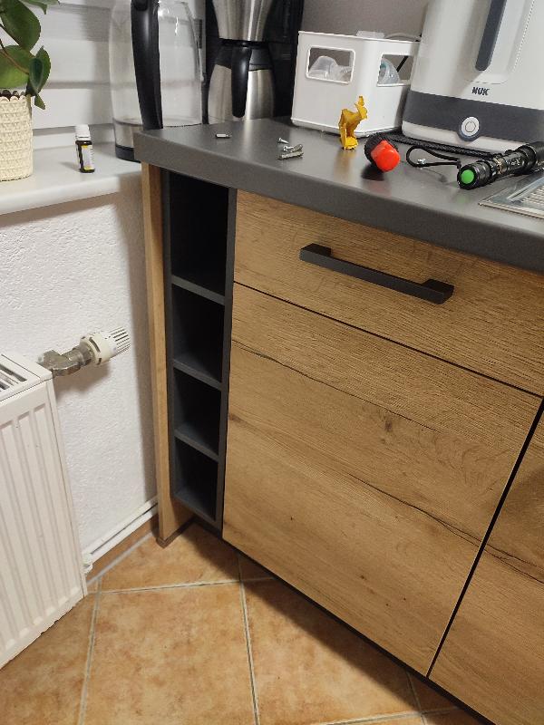 Den Hängeschrank über dem Kochfeld haben wir etwas umgebaut, damit die Abzugshaube und die Gewürze Platz finden. Das einzige,was ich bemängeln könnte, sind die Auszüge, die etwas laut sind. Aber alles in allem für kleines Geld eine sehr schöne Küche.