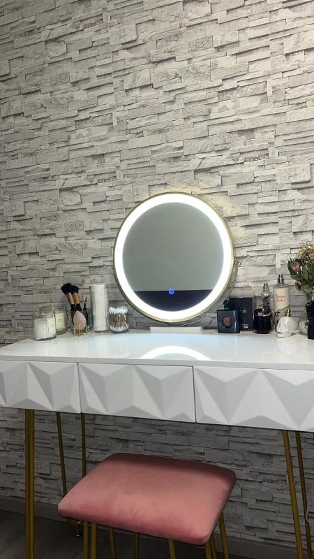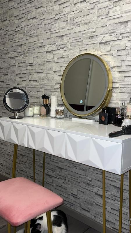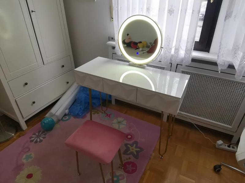 Der ganze Schminktisch ist Hochglanz und wirkt durch die goldfarbenen Tischfüße sehr edel und elegant. Der Schminktisch ist im allgemeinen sehr modern und süß.