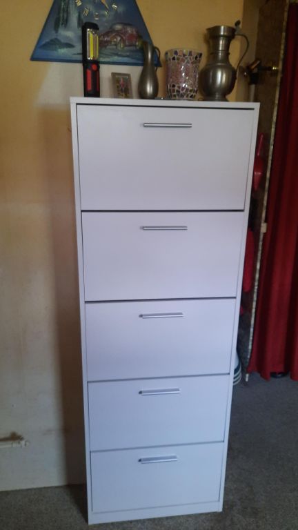Sehr schöner Schuhschrank 2 kleine Nachteile Schuhe der Größe 46 sind etwas zu lang und müssen diagonal verstaut werden Distanzhüsen für die vordertüren sind nur einmal verwendbar, brechen beim entfernen, d.h. eine Demontage ist mit den mitgelieferten Distanzhülsen nicht möglich. also 4,5 Sterne